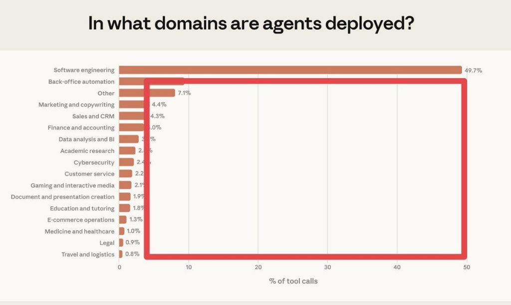 软件工程主导,垂直领域简直空缺Anthropic的数据判辨,软件工程占据了总共AI智能体举止的一半,另一半分散在16个垂直领域,莫得一个进步9%。医疗、法律、西席、客户劳动、物流等领域的阛阓份额均为个位数。