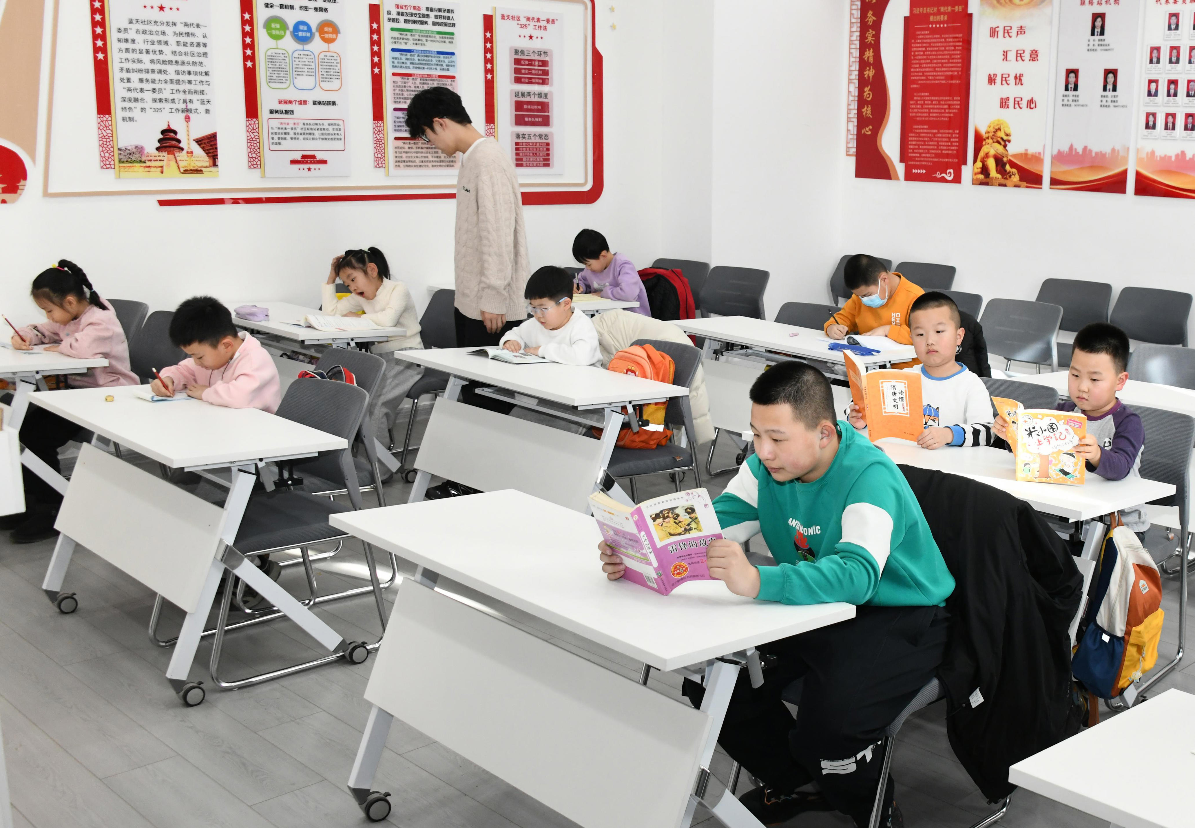社区公益课堂内大学生志愿者正为孩子们进行功课议论。本报记者 张可心 摄