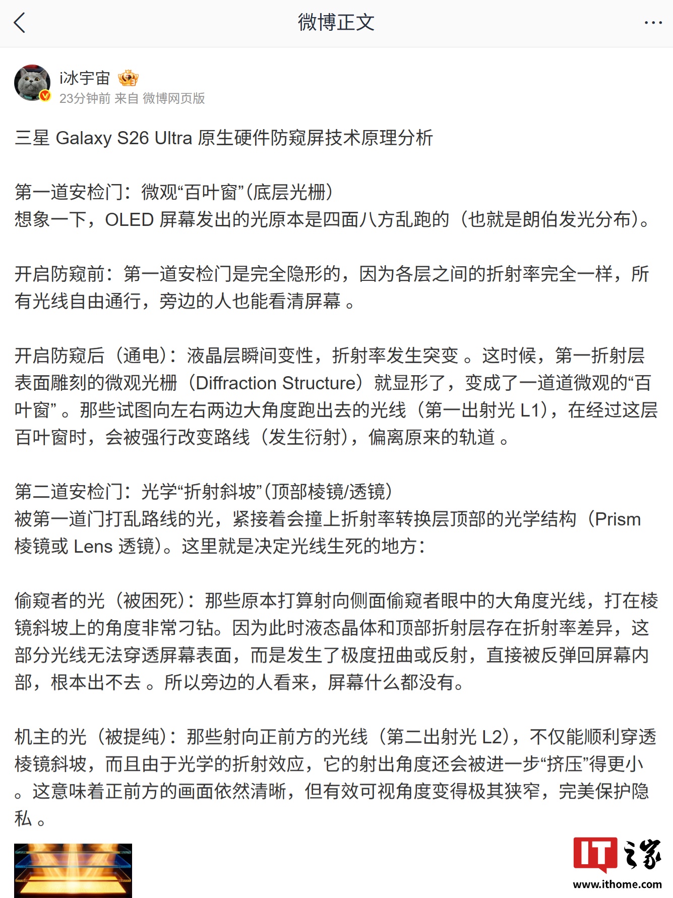 把柄博主 @i冰天地 分析,该工夫领有两说念“安检门”:微不雅“百叶窗”(底层光栅)和光学“折射陡坡”(顶部棱镜 / 透镜),两者共同作用后,幸运五星彩手机官方app下载手机就能产生防窥膜的后果,让其他东说念主无法考察手机的实质。