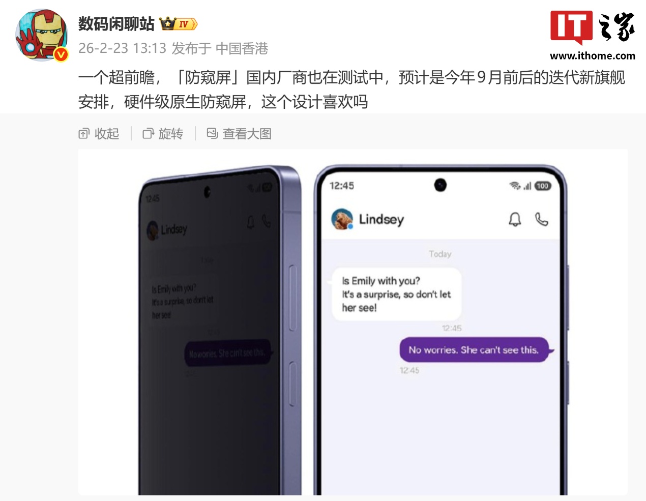IT之家 2 月 23 日音信,博主 @数码闲聊站 当天“超前瞻”爆料:「防窥屏」国内厂商也在测试中,瞻望是本年 9 月前后的迭代新旗舰安排。博主强调,这是“硬件级原生防窥屏”。