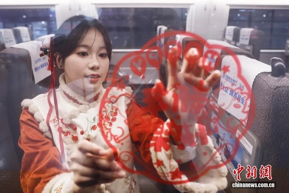 2月2日,列车员在高铁列车车厢内张贴新春主题窗花。中新社记者 殷立勤 摄