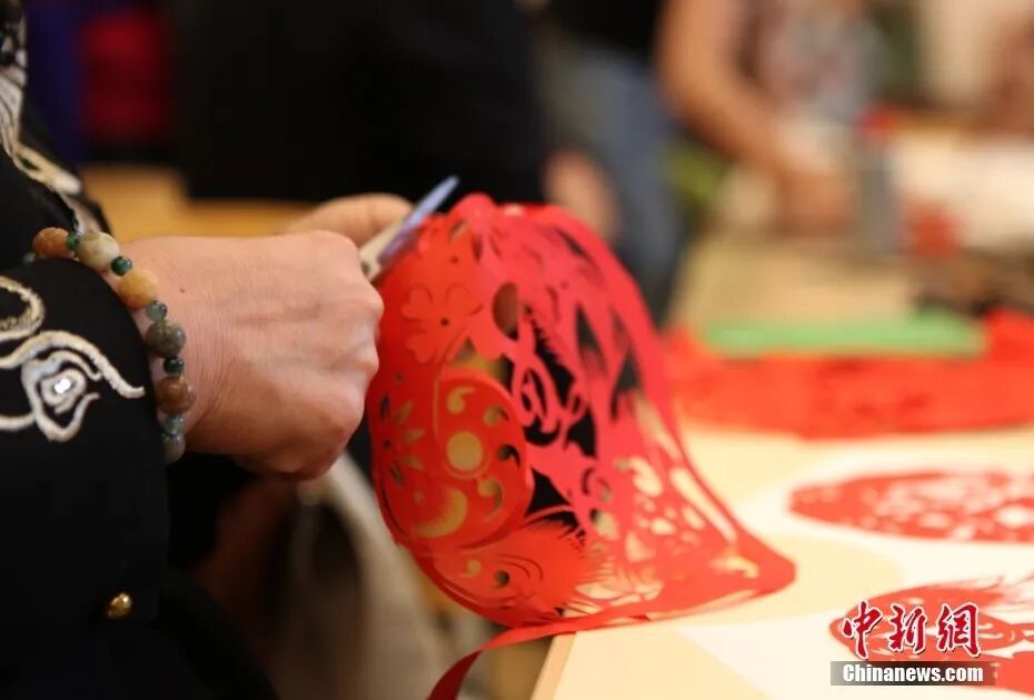 艺术家展示剪纸身手。(良友图)中新社记者 德永健 摄