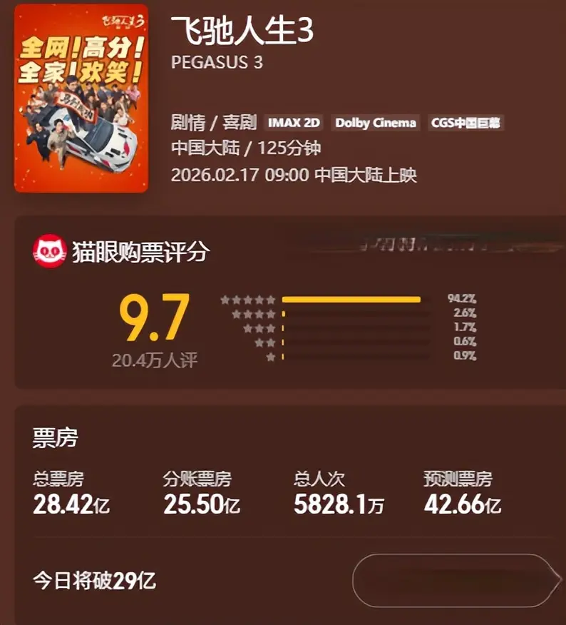 《疾驰东谈主生3》票房破20亿!沈腾有望成为首位主演票房破400亿的演员. 百家号. [2026-02-21].